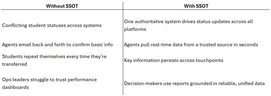 When two systems disagree, say, one has a student listed as “Enrolled” while another says “Pending Docs”, who’s right? The agent is forced to guess, the student gets mixed messages, and accountability disappears.